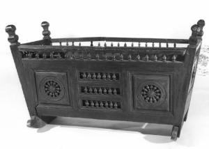 - NOTIZIE STORICO CRITICHE La culla a dondolo, di carattere popolare non priva di una fastosa eleganza, è stilisticamente simile all'armadio conservato nella raccolta ed è probabilmente un rifacimento ottocentesco di un arredo del sec. XVII realizzato nella provincia francese della Bretagna, di cui presenta le tipiche qualità formali, il materiale usato e le decorazioni tornite