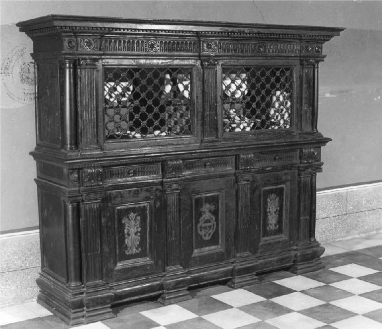 - NOTIZIE STORICO CRITICHE La credenza, insolita per la struttura a doppio corpo e per la presenza dell'alzata a giorno, è un rifacimento tardo ottocentesco di stile eclettico probabilmente realizzato in area lombarda e veneta, di una credenza tipicamente toscana della seconda metà del sec. XVI, di cui riprende soprattutto gli elementi ornamentali ( cfr. l'uso particolare dell'intaglio, le lesene scanalate, le colonne ai lati ) tipici di quel periodo. Per confronti stilistici si veda una credenza attribuita alla metà del sec. XVI di artefice toscano, della collezione Horne di Firenze ( Gregori 1979, p. 42 ). Non è da escludere tuttavia, l'impiego di parti lignee più antiche, come sembrano le formelle intarsiate del corpo inferiore decorate con elementi figurativi, in genere usate per ornare gli arredi toscani verso la fine del sec. XVI
