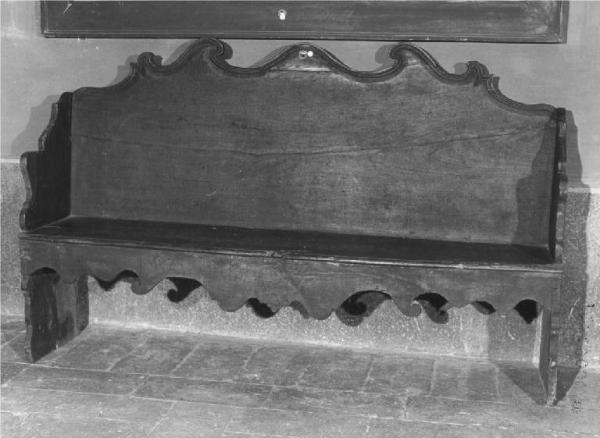 - NOTIZIE STORICO CRITICHE L'arredo di gusto popolare è stato realizzato in Lombardia tra il sec. XVII-XVIII ( cfr. la parte superiore dello schienale già di linea più mossa degli esemplari di fattura secentesca ), con struttura, materiale e qualità dell'intaglio abbastanza comune nei sec. XVII-XVIII nell'area lombarda