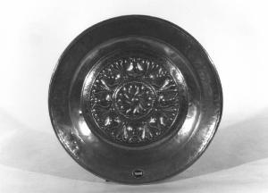 - NOTIZIE STORICO CRITICHE Il piatto, di tipologia comune, veniva probabilmente usato per le elemosine e per l'acqua del battesimo ( secondo Lipinsky 1930, pp. 9-13 ) e si ricollega senza dubbio ad una manifattura di artisti tedeschi giunti verso la fine del sec. XV nell'Italia centrale e stabilitisi soprattutto a Teramo e l'Aquila con qualche probabile diramazione nel Veneto. I modelli di questo tipo di piatto, furono a lungo riprodotti ( sec. XVII-XVIII ) da originali di quell'epoca e usati, in particolare all'inizio del sec. XX, per ornare le case lombarde. Per confronti stilistici si vedano alcuni esemplari quasi uguali a questi conservati nel Museo Civico di Rieti ( Mortari 1960 ) nelle chiese romane di S. Sabrina, S. Tommaso di Canterbury, nella zona bergamasca bresciana cfr. Clusone ( Bg ) e a Milano nella Casa Bagatti Valsecchi ( Toesca, 1918 ). Si noti inoltre che il grosso fiore stilizzato sbalzato al centro di alcuni esemplari è riprodotto su oggetti di produzione profana e di diverso materiale, si veda ad esempio un piatto a smalto attribuito a Venezia, sec. XVI e conservato nella raccolta La Piccirella di Firenze ( Gregori 1979, p. 215 )