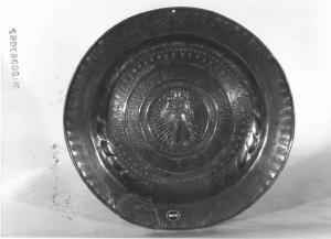- NOTIZIE STORICO CRITICHE Il piatto, di tipologia comune, veniva probabilmente usato per le elemosine e per l'acqua del battesimo ( secondo Lipinsky 1930, pp. 9-13 ) e si ricollega senza dubbio ad una manifattura di artisti tedeschi giunti verso la fine del sec. XV nell'Italia centrale e stabilitisi soprattutto a Teramo e l'Aquila con qualche probabile diramazione nel Veneto. I modelli di questo tipo di piatto, furono a lungo riprodotti ( sec. XVII-XVIII ) da originali di quell'epoca e usati, in particolare all'inizio del sec. XX, per ornare le case lombarde. Per confronti stilistici si vedano alcuni esemplari quasi uguali a questi conservati nel Museo Civico di Rieti ( Mortari 1960 ) nelle chiese romane di S. Sabrina, S. Tommaso di Canterbury, nella zona bergamasca bresciana cfr. Clusone ( Bg ) e a Milano nella Casa Bagatti Valsecchi ( Toesca, 1918 ). Si noti inoltre che il grosso fiore stilizzato sbalzato al centro di alcuni esemplari è riprodotto su oggetti di produzione profana e di diverso materiale, si veda ad esempio un piatto a smalto attribuito a Venezia, sec. XVI e conservato nella raccolta La Piccirella di Firenze ( Gregori 1979, p. 215 )