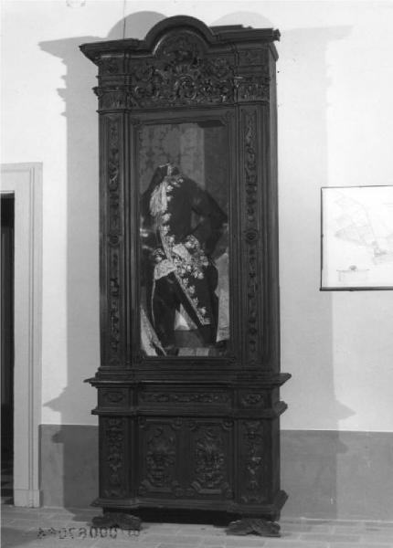 - NOTIZIE STORICO CRITICHE Gli armadi sono stati realizzati, probabilmente in ambito settentrionale con un intaglio accurato e un certo intento decorativo di gusto tardo manierista influenzato dalla produzione di mobili veneti e soprattutto toscani dei sec. XVI-XVII. Ma la struttura non proporzionata, l'uso dei vetri, la scelta di motivi decorativi precedenti ( testine di cherubino alato, pendoni di frutti, volute, motivi a pelacette ) i piedi a mensola tipicamente secenteschi, li fanno ritenere una ripresa del sec. XIX ( 1870 ca. )