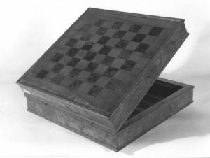 Scatola quadrata, di radica di noce dipinta sulla parte superiore a scacchiera colore bruno, all'interno la scatola è foderata con panno pertinente verde alternato a triangoli verdi e rossi, serramenti e serratura coevi.