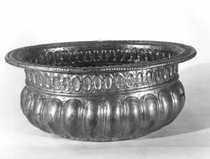 Bacili di forma ovale, base rigonfia decorata con bacellature, sulla fascia superiore motivo a ovuli ritmati sbalzati "a rovescio", bordo dentellato.