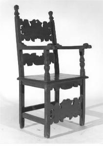 Seggiolone di massello di noce, color naturale, alto dorsale costituito da fasce trasversali a doppie cartelle intagliate, riprese sulla cintura, alti braccioli intagliati leggermente ricurvi poggianti su doppi balaustri decorati ad intaglio, poggiante su semplici gambe squadrate, guide lisce terminanti a balaustro, semplice sedile liscio.