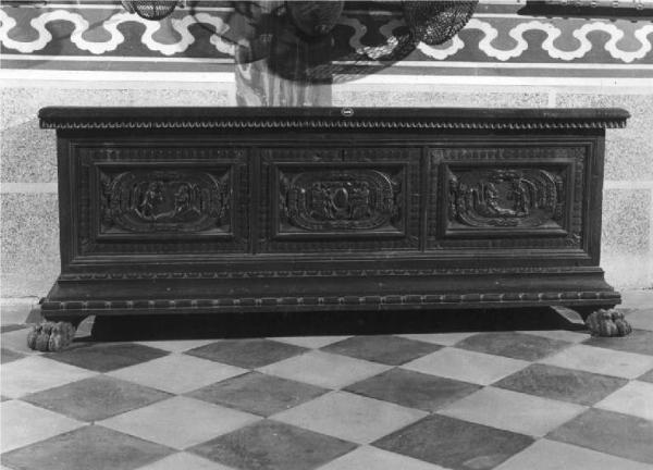 - NOTIZIE STORICO CRITICHE L'arredo è un probabile rifacimento ottocentesco realizzato da bottega veneta, come attestano i motivi decorativi fiacchi e ripetuti, il coperchio, l'incorniciatura delle formelle, l'intaglio piuttosto grossolano. Si rifà tuttavia a tipici modi ricorrenti nella produzione veneta dell'entroterra di arredi sacri e profani: frontale tripartito, influenza decorativa e manierista della scuola di Fontainebleau nelle formelle, piedi ferini. Per confronti stilistici con arredi cinquecenteschi, si veda il cassone di una collezione privata, attribuito ad area veronese della metà del sec. XVI ( Alberici 1980, p. 55 ), oltre agli esemplari originali della Raccolta