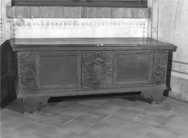 - NOTIZIE STORICO CRITICHE L'arredo è un esempio di ricostruzione ottocentesca in parte ottenuto con materiale originale di altra provenienza ( cfr. le semplici specchiature e il basamento ). Realizzate con tipologia banale e intaglio grossolano le tre formelle così come i piedi a mensola ed il coperchio sono probabilmente di materiale antico adattato nel sec. XIX