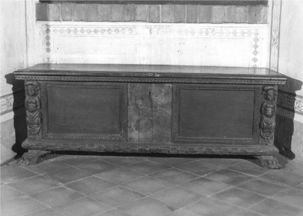 - NOTIZIE STORICO CRITICHE Esemplare di tipologia assai comune in tutta Italia. E' un probabile arredo ottocentesco, che riprende, con intagli grossolani e decorazione assai trita, i motivi ornamentali in particolare lombardi, d'epoche precedenti. Si vedano i piedi ferini, ( sec. XVI ), le cariatidi con fiori legati da nastri ( sec. XVIII )