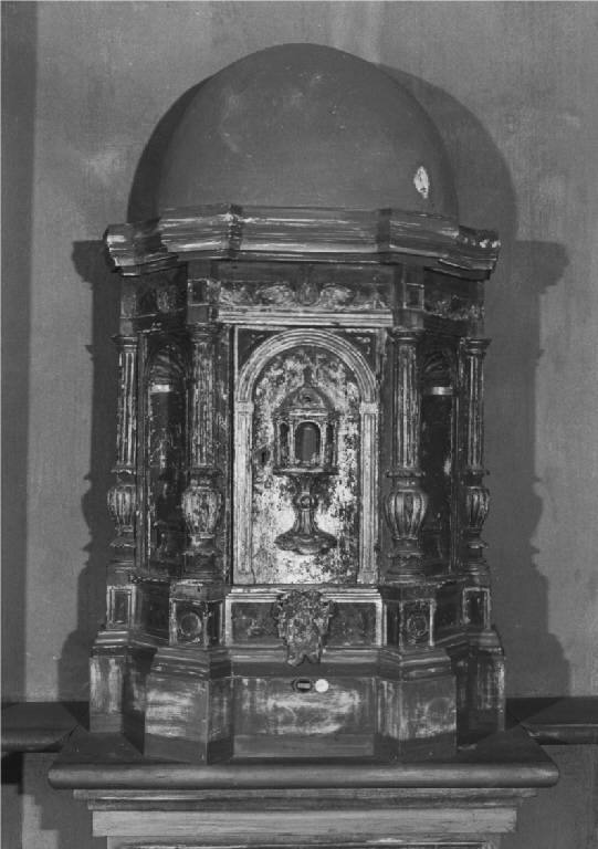 Ciborio di legno dolce dipinto di rosso di verde e dorato, alta base pentagonale, ai lati due nicchie sormontate da conchiglia con piedistallo, prive di statuette, alternate a lesene formate da urne con colonne scanalate poggianti su plinti, al centro porticina ad arco a tutto sesto scanalata e dorata e ostensorio su fondo dorato, sulla sommità testa di cherubino alato, alla base cartiglio con stemma (?) sormontato da timpano sporgente e cupola azzurra.