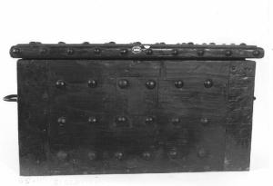 Cassaforte in legno dipinto di nero, rafforzata sugli spigoli e sui bordi con bandelle di ferro applicate con chiodi, tutta la cassaforte è ornata con borchie rotonde metalliche, facciata con serratura chiusa, ai lati due maniglie rigide di ferro battuto.