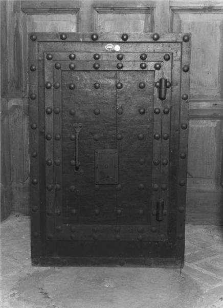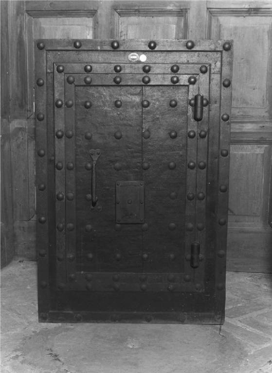 Grande cassaforte, rafforzata con bandelle di ferro e grosse borchie, facciata rettilinea, composta da due parti nella specchiatura interna, serratura originale applicata nella parte inferiore, serramenti originali, impugnatura in ferro battuto.