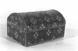 Cofanetto a baule, legno di noce rivestito di cuoio nero sbalzato e lievemente inciso e dorato, applicato con piccoli chiodi d'argento sbalzati a mano su doppia fila, parte interna foderata di damasco coevo giallo, serramenti recenti.