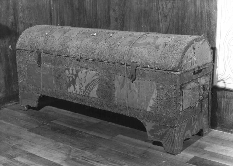 Cassone, coperchio convesso rivestito di damasco rosso tagliato e applicato su struttura lignea, facciata rettilinea decorata con ornamenti di ferro sbalzati, applicati con borchie metalliche rotonde riprese sul coperchio e sui lati ornati anche con due maniglie di ferro battuto, poggiante su quattro piedi a mensola, interno foderato di stoffa tipo canapa rossiccia molto rovinata.
