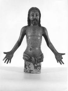 Statua di legno dolce, scolpita a tutto tondo, raffigurante di tre quarti il Cristo.