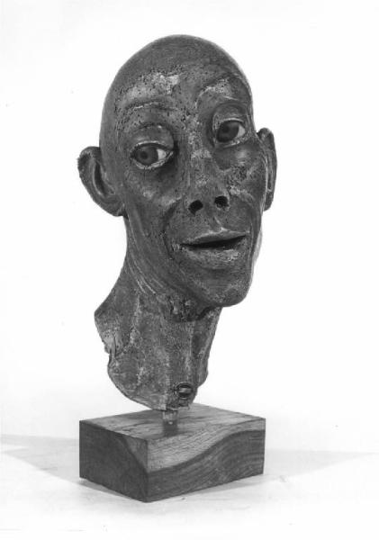 Testa virile di cartapesta leggermente piegata a sinistra, colore bruno, posta su base lignea di fattura recente.