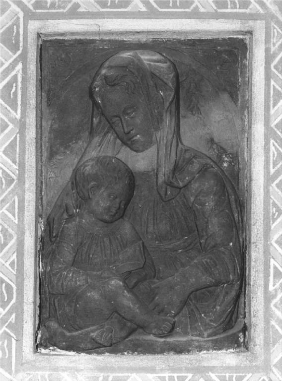 Formella di terracotta di colore naturale, raffigurante ad altorilievo la Vergine di tre quarti, a sinistra, il Bambino, sfondo ad arco a tutto sesto con ghirlande di fiori e teste di cherubino sugli angoli.