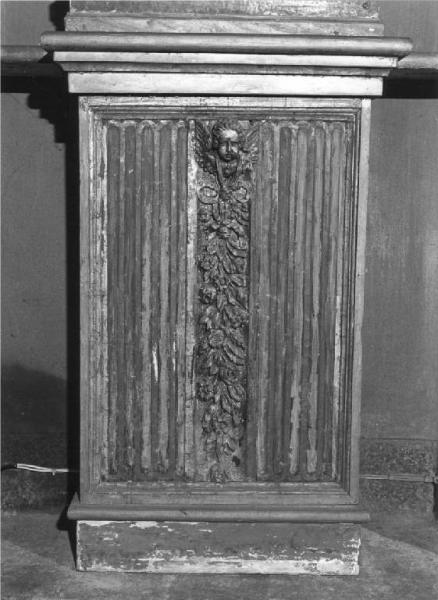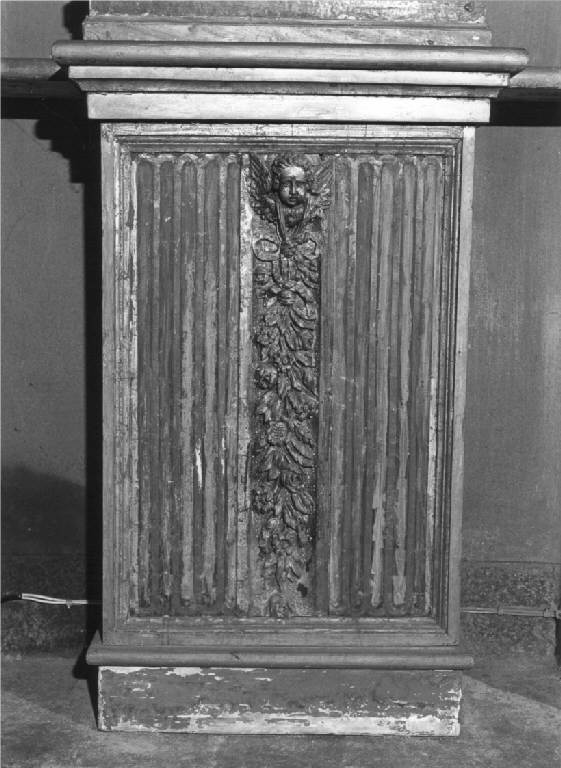 Basamenti rettangolari, di legno dipinto d'azzurro e oro, con facciata ornata da scanalature, motivo centrale con testa di cherubino alato con nodi e pendoni di fiori, semplice basamento pieno.