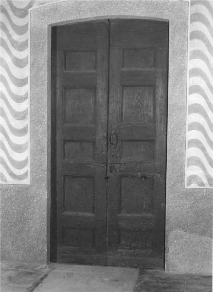 Porta a bue battenti di massello di legno dolce naturale, decorato con cinque semplici formelle rettangolari per ciascun battente, intagliate nel massiccio, impugnatura a maniglia rigida di ferro battuto, serramenti e serratura originali di ferro battuto con motivo ornamentale zoomorfo, coevo.