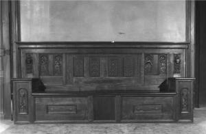 Panca di massello di noce ad andamento rettilineo, ornato con ampio schienale con cinque formelle intagliate a motivi vegetali fiancheggiati da due formelle per parte con personaggi e una con testa di cherubini, pesante sedile pieno decorato con quattro formelle, due con motivi ornamentali e due con testa di cherubino e pendoni di frutta posta in modo da formare i braccioli della panca.