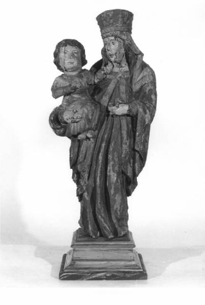 Statua di legno dolce intagliato a tutto tondo e dipinto, a figura intera, posta su base sagomata rappresentante la Madonna con Bambino a figura intera Vergine con tunica rossa che le copre anche il capo, con sguardo assorto mentre sorregge il Bambino, che a sua volta regge il Globo.