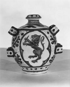 Fiasca maiolicata cosiddetta da pellegrino, piuttosto larga e bassa, decorata sottosmalto in avorio e blu con leone rampante accanto un pugnale e tutt'intorno foglie d'acanto, sui fianchi doppi passanti di maiolica, le due facce si corrispondono.