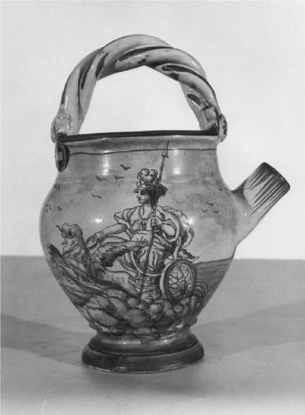 Brocca di maiolica decorata a monocromia turchina su fondo azzurrino, corpo panciuto con piedistallo basso, corto becco e manico a volute molto intrecciate.