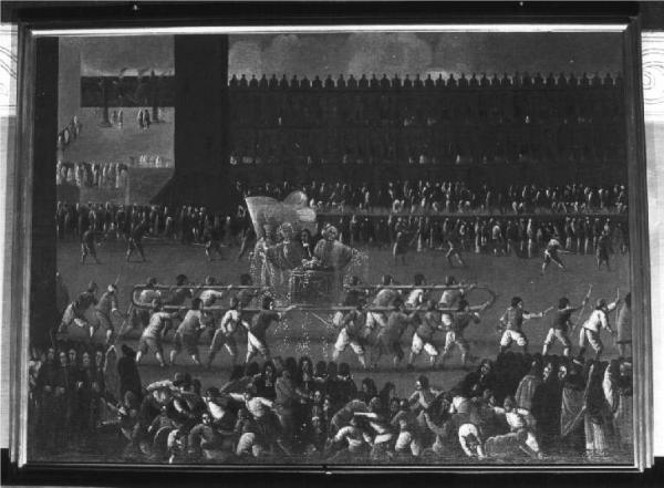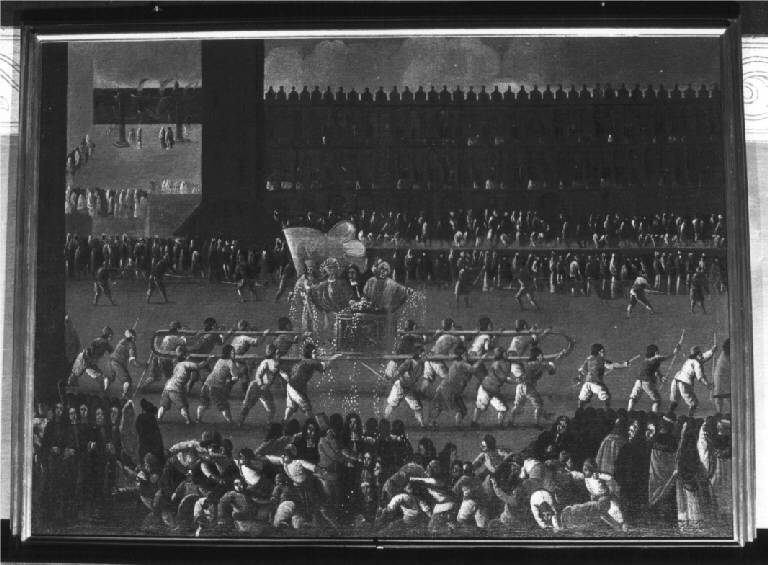 - NOTIZIE STORICO CRITICHE I dipinti formano una serie di sei, stilisticamente molto simili e sono raffigurazioni di feste, cerimonie, spettacoli tradizionali veneziani dipinti e incisi che abbondano nel '700, ma che sono assai rari nei secoli precedenti. Si rifanno all'opera di Giuseppe Heintz il Giovane, nordico di nascita, ma veneziano d'adozione, pittore brioso e divertente nel descrivere i vari episodi e nell'interpretare particolarità di costume e di vita del tempo, con vivaci macchiette alla Callot, preziosi documentari del tempo. Questo dipinto raffigura una delle più importanti solennità della vita della Serenissima riferentesi tutte alla sovrana persona del Doge ed in particolare alla sua elezione che si riassumeva in tre momenti principali; presentazione al popolo acclamante nella basilica ducale, il giro "in pozzetto" qui raffigurato attorno alla piazza portato a spalle dagli Arsenalotti fra la folla accorsa ad afferrare le monete che egli lanciava tra il popolo, infine l'incoronazione allorché dall'alto della scala dei Giganti egli giurava fedeltà alla Promissione e riceveva il berretto ducale ( Lorenzetti 1937, p. 8 - 9 )