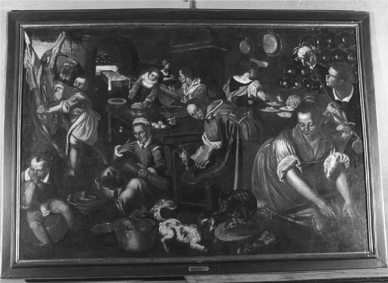 E' raffigurata l'attività di un gruppo di persone ritratte in cucina intente a preparare un pranzo, in primo piano una donna sta preparando un tacchino, al suo fianco un ragazzo infila polli su uno spiedo, a sinistra un ragazzo soffia su una vescica, una donna anziana seduta assaggia leccandosi un dito quanto sta rimestando in un mortaio, un'altra prepara piccioni, altre in secondo piano preparano una sfoglia, un'altra dei dolci, a sinistra due uomini stanno squartando un animale, in primo piano un cane e un gatto si contendono un osso, toni dorati, cornice lignea non pertinente.