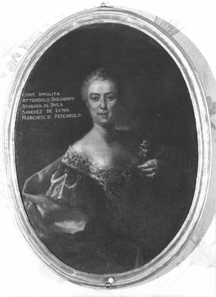 - NOTIZIE STORICO CRITICHE Ippolita figlia di Antonio, capitano nel 1711 e morto nel 1767, sorella di Paolo e di Vittorio, e di Marianna Carlotta del Marchese Alfonso del Carretto e di Rho; morì senza prole, pochi anni dopo le nozze con Alfonso Sanchez de Luna, marchese di Pescarolo e duca di S. Elfidio ( Calvi 1884, tv. V ). Il dipinto di tipo convenzionale e di mediocre qualità pittorica è attribuito da una targhetta applicata sulla cornice al pittore Omodeo ( ? ). Datazione confermata dal costume femminile ancora settecentesco strutturato sul bustino aderente e molto scollato con ricca trina e maniche corte al gomito