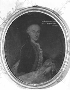 E' raffigurato in tela ovale il conte in età matura, di tre quarti, lo sguardo fisso, leggera parrucca con marsina scura, colletto di pizzo e ampio manto rosato, fondo scuro, entro cornice ovale modanata e coeva di legno dorato in mediocre condizione.