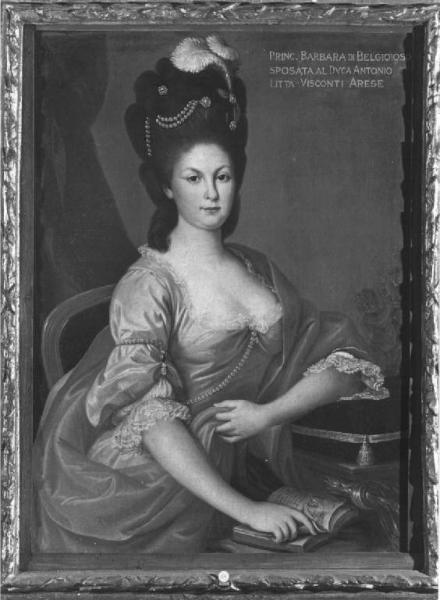 - NOTIZIE STORICO CRITICHE Donna Barbara Barbiano ( 1789 - 1833 ) figlia di D. Antonio Principe del S.R.I. e di Belgioioso, Cavaliere del Tosan d'oro e di Anna Ricciarda d'Este dei Marchesi di S. Martino fu prima dama d'onore di Giuseppina Beauharnais Regina d'Italia ( 1805 ). Si unì in matrimonio l'8 gennaio 1775 con Antonio Litta Arese ( 1748 - 1820 ) uno dei 60 decurioni, eletto duca nel 1808, granciambellano e senatore del Regno d'Italia nono di Giulio. Non ebbe figli. Il ritratto della principessa è opera di non grande qualità di un anonimo artista lombardo. "Ritardatario" è anche l'abbigliamento della dama ancora tipicamente settecentesco: grande scollatura quadrata, maniche al gomito e in paricolare l'elaborata parrucca ornata di gioielli