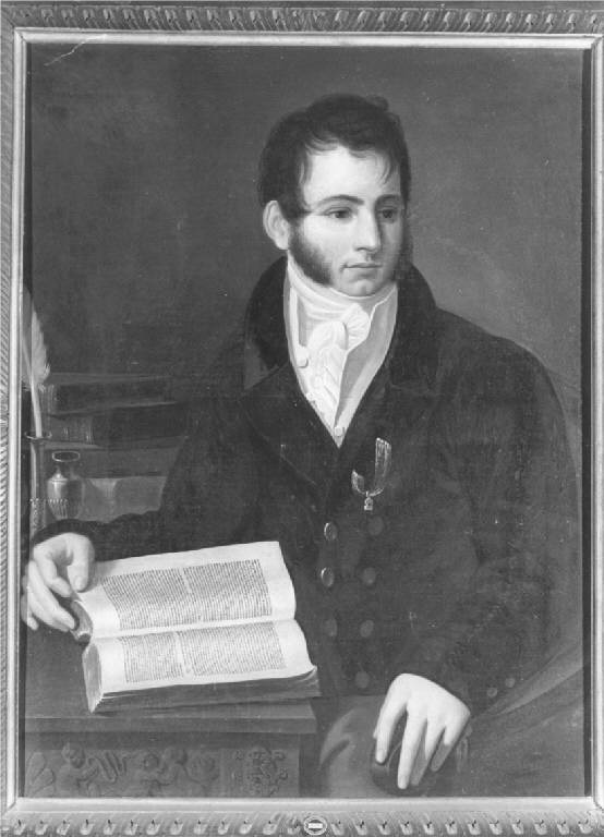Ritratto di giovane gentiluomo, di tre quarti, il volto pensoso rivolto a destra e elegante abbigliamento, con giacca scura e colletto bianco, mentre sta sfogliando un libro aperto posto su un tavolino con accanto il calamaio, con la penna d'oca e alcuni libri; cornice lignea intagliata