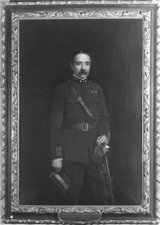 E' raffigurato il conte in età matura, di tre quarti, in piedi in divisa grigio verde da tenente colonnello della Sanità, il berretto nella mano sinistra, la destra sulla sciabola, entro cornice di legno intagliato e dorato.
