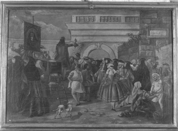 E' raffigurata , a colori vivaci una scena carnevalesca, con molti personaggi in maschera e "bautta", che stanno ascoltando le virtù di un prodotto offerto da un uomo posto su un palco, sullo sfondo architettura, cornice di legno dorato.