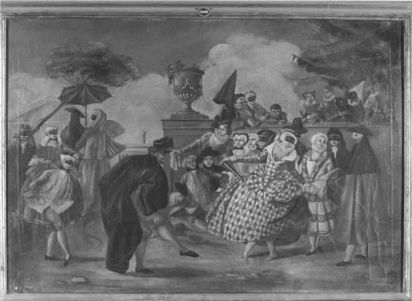 E' raffigurata una scena in giardino, a colori vivaci, carnevalesca, con molti personaggi in maschera e "bautta", mentre stanno assistendo alla danza tra Colombina e Pantalone, cornice di legno dorata.
