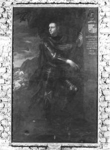 E' raffigurato il gentiluomo guerriero, a figura intera, in età giovanile, pesante armatura e drappo rossiccio del comando, gamba destra piegata mentre volge il capo a destra e regge con la mano sinistra il bastone, fondo scuro, a sinistra si apre una scena di combattimento in un paesaggio con monti, a destra in alto arma: inquadrato nel 1 e 4 con fasce ondate, nella 2 e 3 con fiore dall'elmo con svolazzi esce corona e cimiero lupo nascente con un giglio nella zampa destra cornice di legno con piccole foglie ritmate intagliate, coeva.