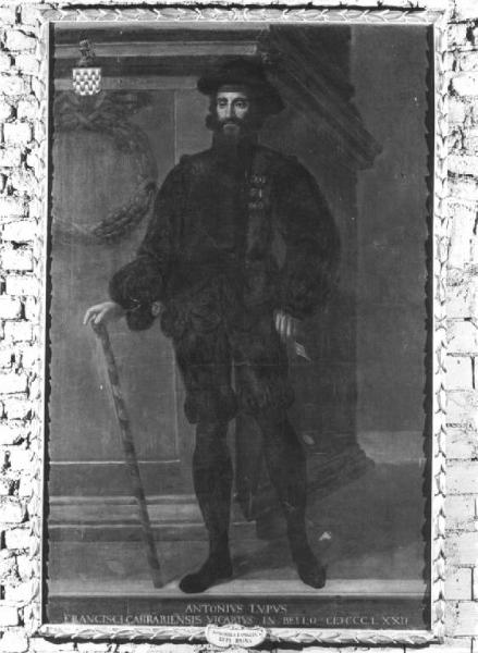 E' raffigurato il personaggio a figura intera, in età matura, barbuto e con i capelli lunghi, copricapo nero rotondo, corsetto, pantaloni a sbuffo e calze nere, nella mano destra il bastone del comando, un oggetto nella sinistra, sullo sfondo una colonna con corona di lauro, a sinistra in alto arma: fasce a ondate con cimiero, corona da cui esce il lupo.