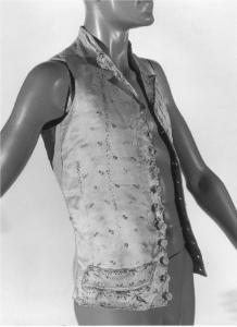 - NOTIZIE STORICO CRITICHE La sottoveste o panciotto subisce trasformazioni sensibili e parallele all'evoluzione della marsina. Assume pertanto un taglio più funzionale e verso l'ultimo decennio del secolo si allunga ed è completamente chiusa da bottoni e talvolta è chiusa con doppia fila di bottoni, per adeguarsi alla verticalità della linea neoclassica. Datazione confermata anche dalla decorazione ricamata di tipica produzione lombarda nella ripresa di motivi naturalistici. Per confronti stilistici si veda oltre alle altre della Raccolta una sottoveste della Civica Raccolta del Castello Sforzesco, datata 1785 ca. ( Buttazzi 1976, p. 59 )