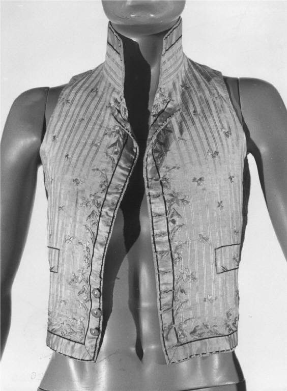 - NOTIZIE STORICO CRITICHE La sottoveste o panciotto subisce trasformazioni sensibili e parallele all'evoluzione della marsina. Assume pertanto un taglio più funzionale e verso l'ultimo decennio del secolo si allunga ed è completamente chiusa da bottoni e talvolta è chiusa con doppia fila di bottoni, per adeguarsi alla verticalità della linea neoclassica. Datazione confermata anche dalla decorazione ricamata di tipica produzione lombarda nella ripresa di motivi naturalistici. Per confronti stilistici si veda oltre alle altre della Raccolta una sottoveste della Civica Raccolta del Castello Sforzesco, datata 1785 ca. ( Buttazzi 1976, p. 59 )
