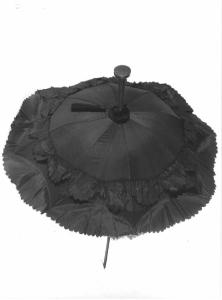 Parasole da lutto, di seta nera guarnita con doppia balza centinata, bastone di legno dipinto di nero, impugnatura d'argento e fodera interna marrone, puntale di legno nero, nappa di seta nera; il secondo è di seta nera guarnita con doppia balza centinata, bastone di legno dipinto di nero, puntale di legno nero, nappa di seta nera.