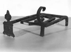 Alari di bronzo fuso, con base rettangolare gradinata e di diversa dimensione, con specchiatura decorata con motivo floreale stilizzato, su questa poggia un'urna ornata da nastri, parti di sostegno in ferro battuto