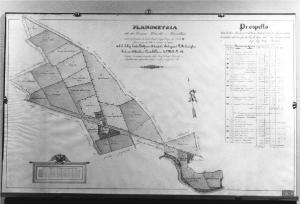 Planimetria delineata in inchiostro di china e acquarellato a diversi colori, incorniciata sotto vetro: due tenute di Musella e Musellina di Sant'Angelo Lodigiano con i diversi campi e fabbricati, a sinistra prospetto della scala Trabuchi.