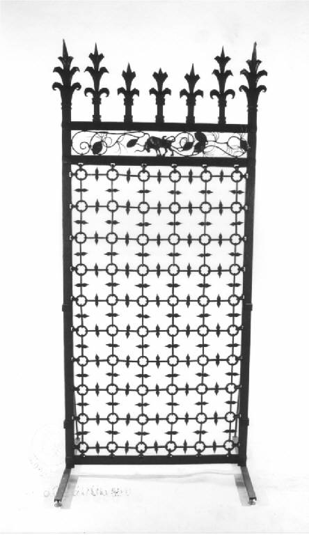 Cancello catenario di ferro battuto, ornato con semplici tondi uniti da segmanti con piccole foglie, parte superiore decorata con al centro il toro, ai lati rami intrecciati di pino e pigne, sormontato da aculei di diversa misura