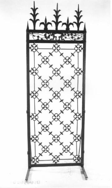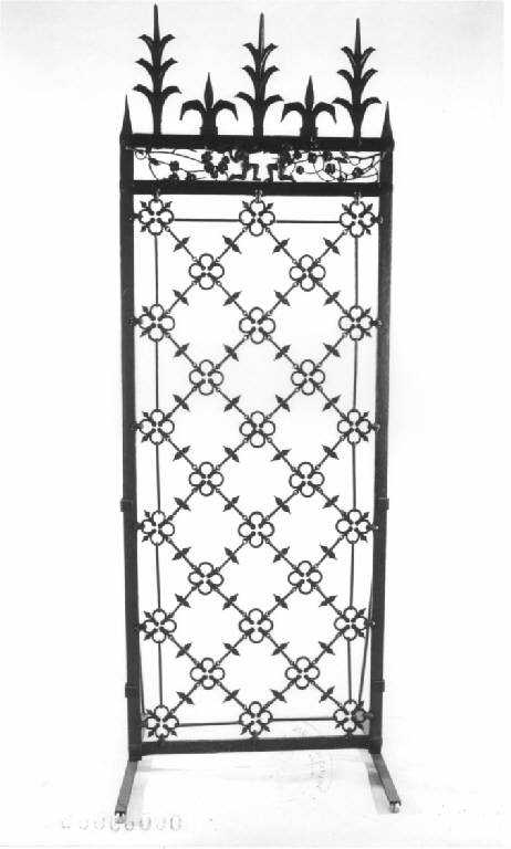 Cancello catenario di ferro battuto, ornato con leggeri quadrilobi di piccola dimensione uniti da barrette alternate a piccole foglie, parte superiore decorata da specchiature con al centro i due gemelli, ai lati rami di fiori di pesco intrecciati, sormontato da rami stilizzati di diversa misura.