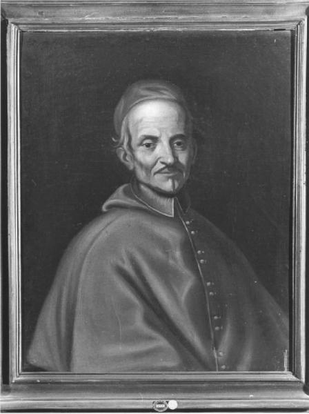 E' raffigurato a mezzo busto un cardinale, in età matura con capelli grigi e pizzetto, sulle spalle la mozzetta e il berretto rosso, fondo scurocornice di legno intagliato e dorato non pertinente.