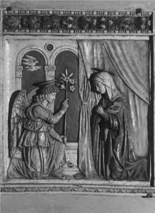 E' raffigurata in terracotta policroma a rilievo invetriato, l'Annunciazione, secondo l'iconografia tradizionale con a sinistra l'angelo annunziante inginocchiato, con un giglio nella mano sinistra, a destra la Madonna con manto azzurro inginocchiata con le mani incrociate sul petto, tendaggio giallo, fondo con trifora e colomba, incorniciatura con bordo a pendoni di frutti gialli azzurri con fogliame verde.