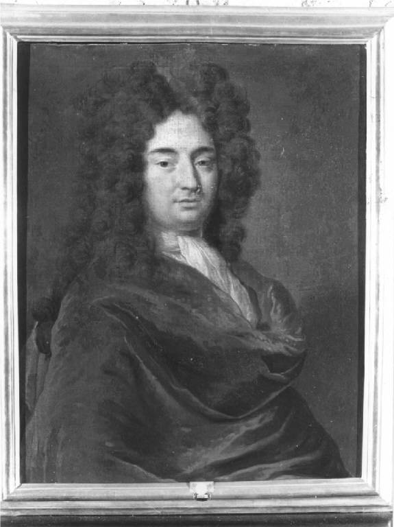 Gentiluomo, in età matura, di tre quarti, parrucca scura a riccioli, avvolto in ampio manto di velluto rosso vinato con colletto bianco, fondo scuro.
