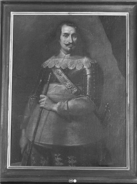 E' raffigurato di tre quarti un gentiluomo dai lunghi capelli, con baffi e pizzetto, in età matura, costume alla fiamminga; colletto piatto con pizzo e larghi calzoni, bastone del comando nella mano sinistra, a destra s'intravvedono due cavalieri, fondo con tendaggio scuro, cornice di legno non pertinente.