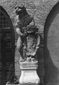 Leone rampante a tutto tondo, che regge uno scudo sormontato da corona su cui sono raffigurati cinque stemmi, scudi inquartati con un quinto "sopra il tutto", i quarti in alto a sinistra e in basso a destra sono dei Bolognini, quello di sinistra sopra il tutto sembra dei Vimercati; posto su alto basamento sagomato di pietra chiara.