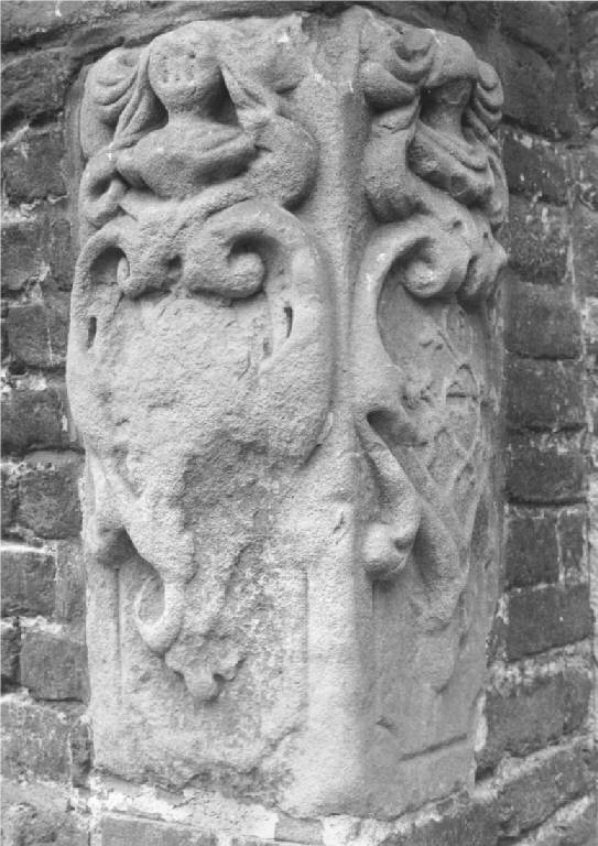 Doppio rilievo di pietra arenaria collocato ad angolo, raffigurante due stemmi nobiliari, quasi del tutto illeggibili, volute sormontati da cimiero.